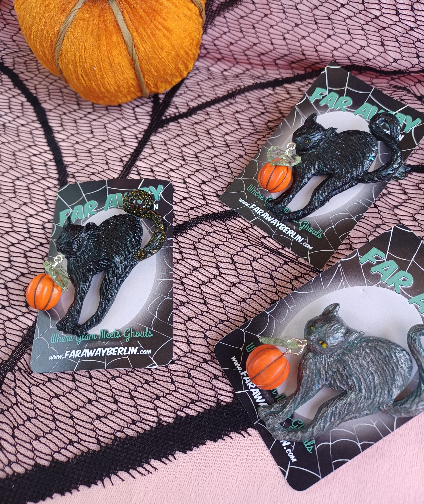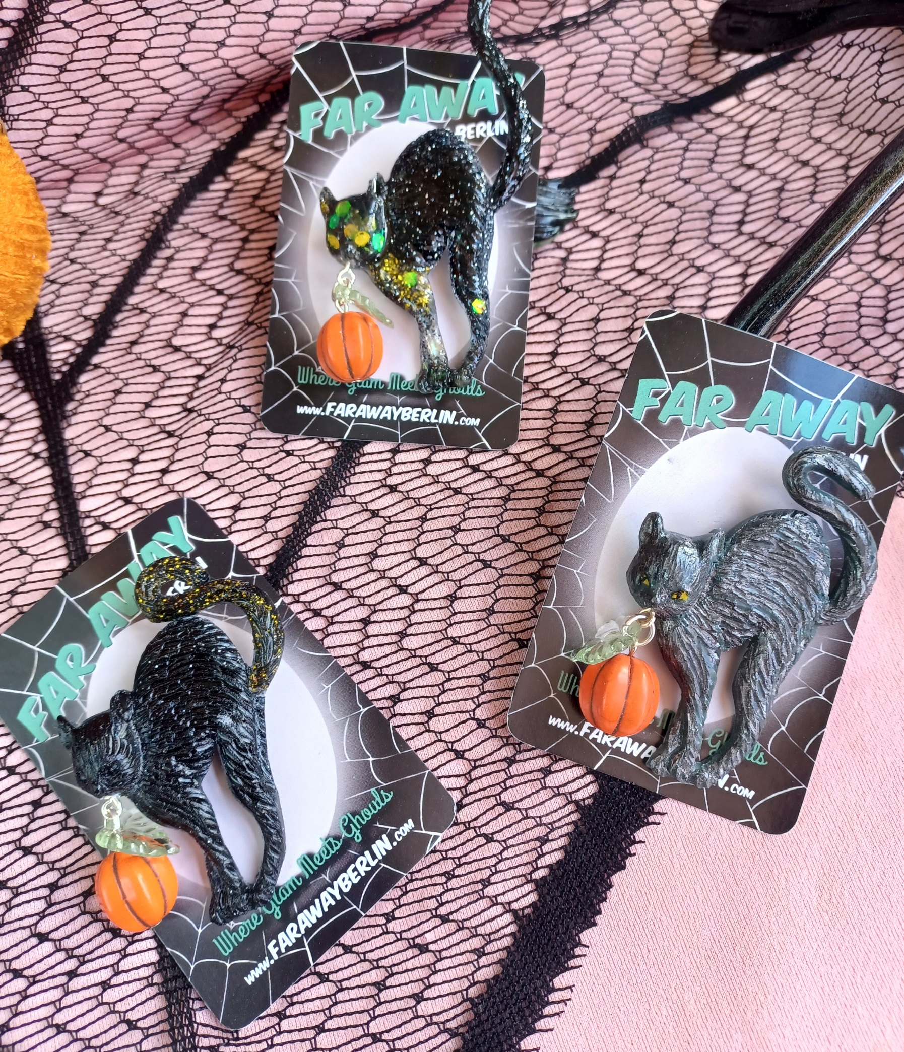 Transform your Halloween outfit with this Black Cat & Pumpkins brooch, a bewitching combo of superstition